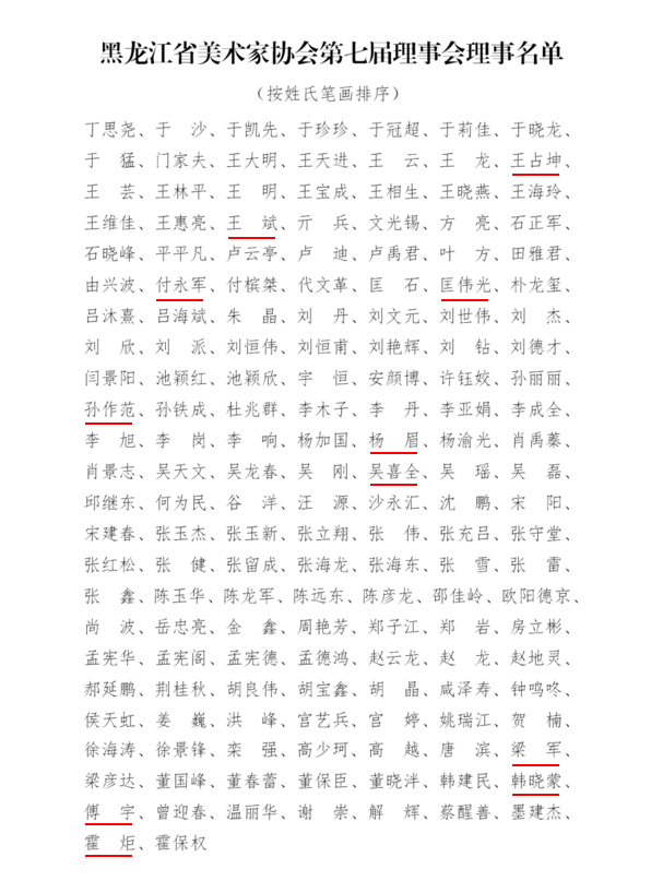 (文/高亮、邢珺)1月5日,黑龙江省美术家协会第六次代表大会胜利召开。大会审议通过了《关于<黑龙江省美术家协会工作报告>的决议(草案)》和《关于修改<黑龙江省美术家协会章程>的决议(草案)》等内容,并选举产生了新一届理事会。艺术与设计学院教师王斌、孙作范当选省美协第七届主席团副主席,霍炬、王占坤、杨眉当选省美协第七届理事会理事。同时,校友匡伟光、吴喜全、付永军当选副主席,校友韩晓蒙、傅宇、梁军当选理事。